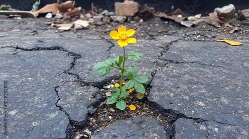 Delicate small flower triumphantly growing through a cracked street surrounded by asphalt and debris symbolizing resilience and hope in an urban landscape full of challenges