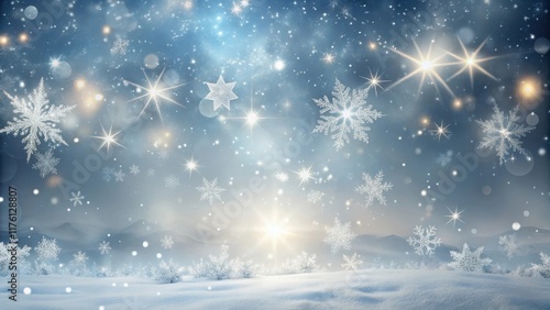 Delicate snowflakes and stars gently fall on a serene winter background with soft, white
