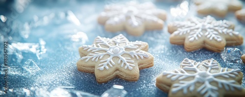 Delicate snowflake-shaped cookies topped with white icing, perfect for festive celebrations and holiday gatherings.
