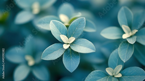 Delicate, teal-hued foliage close-up. Soft, muted tones create a serene ambiance
