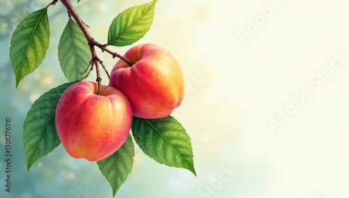 Delicate watercolor apricots on branch, lush foliage , organic, sunlight