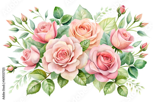 Delicate watercolor arrangement of blooming pink and peach roses with lush green leaves and buds, creating an elegant floral bouquet isolated on transparent background