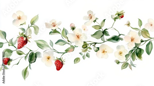 Delicate Watercolor Floral Border with Strawberries and Blossoms