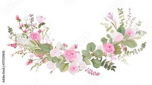 Delicate watercolor floral wreath featuring pink roses, softly illuminated with elegant composition.