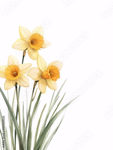 Delicate Watercolor Illustration of Three Yellow Daffodils on a White Background in a Minimalist Style Featuring Soft Textures and Subtle Colors