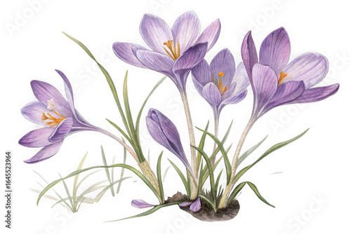 Delicate watercolor painting of purple crocus flowers blooming in early spring isolated on transparent background