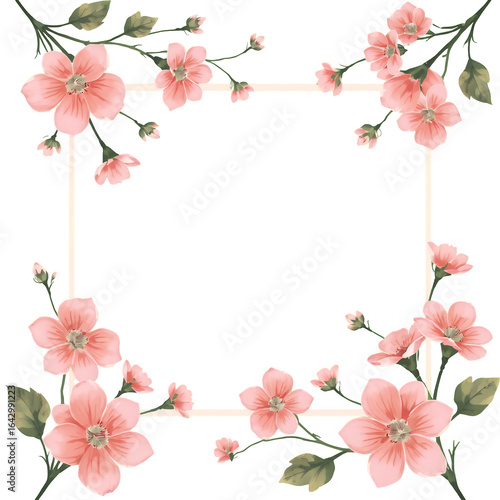 Delicate watercolor pink cherry blossom flowers forming a square border isolated on transparent background