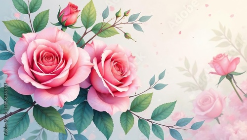 Delicate watercolor roses, intertwined leaves, soft pastel hues, vintage, elegant, flowers