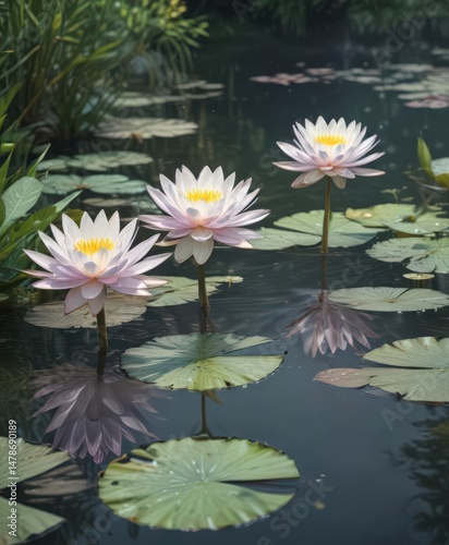 Delicate watercolor water lilies, serene garden setting , illustration, creative