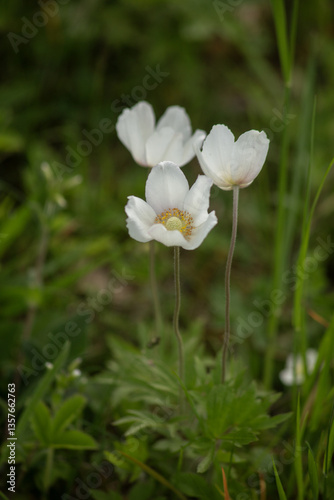Delicate White Anemone Flowers Blooming in Spring Meadow. Vertical frame.