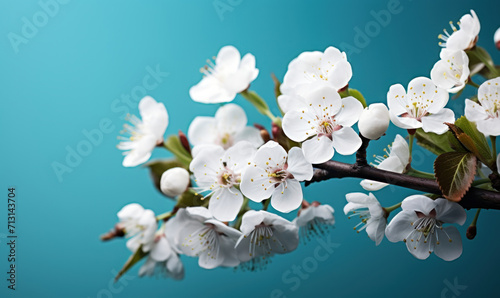 Delicate white cherry blossoms on a branch with vibrant turquoise background, symbolizing spring renewal and natural beauty in a minimalist style