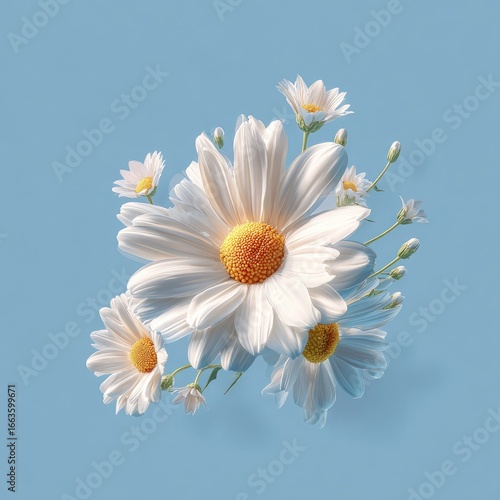 Delicate white daisies, soft, light, and airy, arranged in a bouquet against a light blue background