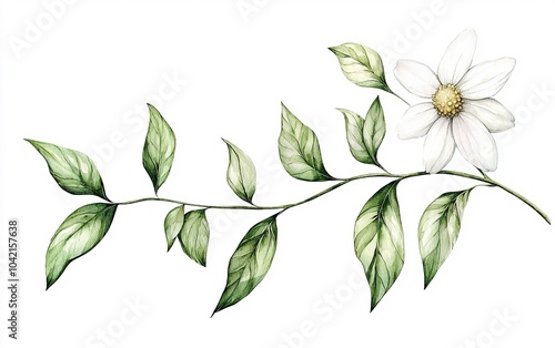Delicate white flower with green leaves in an artistic botanical illustration on a clean background, showcasing natural beauty and elegance