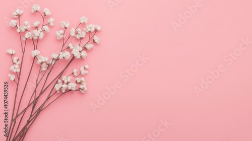 Delicate white flowers arranged on a soft pink background, perfect for spring or wedding themes, adding a touch of elegance.