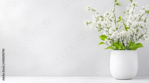 Delicate white flowers in a simple white vase against a light gray background