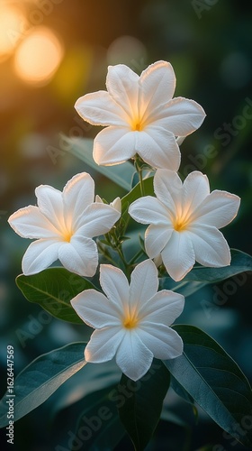 Delicate white flowers with a hint of yellow bask in the warm glow of the setting sun
