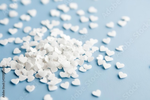 delicate white heart confetti scattered across a soft powder blue background, creating a romantic minimalist composition with gentle shadows and subtle texture for valentine's day designs