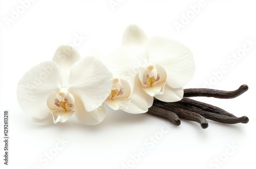 Delicate White Orchid Flowers with Vanilla Beans on White Background for Nature, Decor, and Beauty Themes in Photography and Design Projects