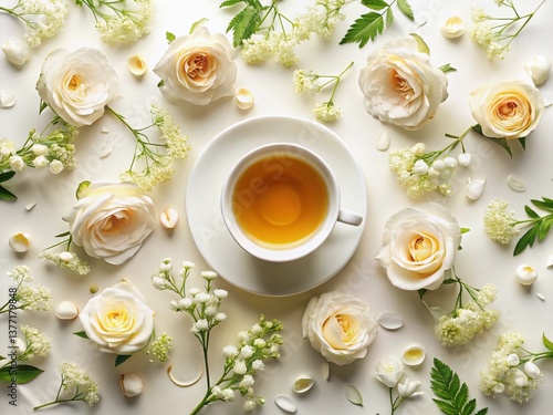 Delicate White Rose & Acacia Tea Flower Composition - Top View