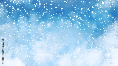 Delicate white snowflakes gently fall against a soft, blurred blue background, creating a serene winter scene. The snow-covered landscape adds a peaceful, seasonal ambiance.