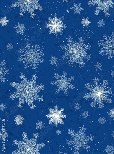 Delicate white snowflakes gracefully descend against a deep blue backdrop, creating a beautiful winter wonderland pattern perfect for seasonal designs.
