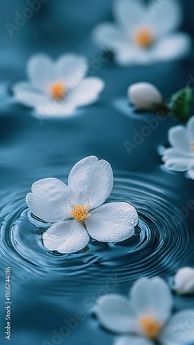 Delicate white spring blossoms drifting across rippling pale blue water, evoking peaceful spa like tranquility and small flower floating vertical background