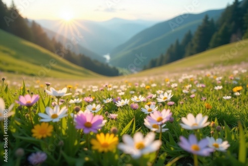 Delicate wildflowers carpet a sunlit hillside , pastel, colorful, ecology