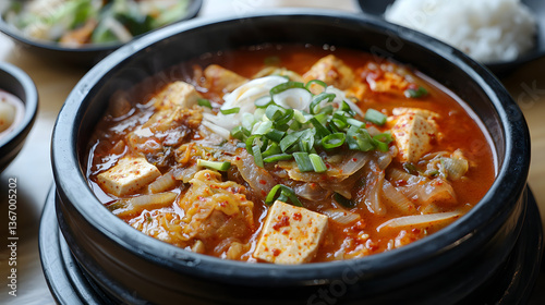 Delicious Aged Kimchi Stew Simmering in a Hot Stone Bowl with Soft Tofu and Green Onions