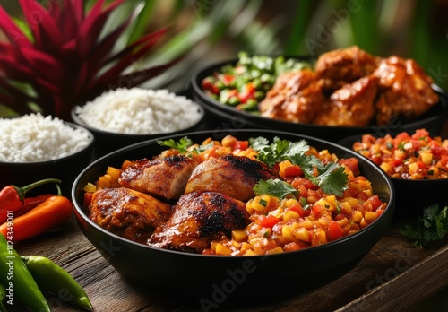 Delicious and Colorful Dish with Grilled Chicken Thighs Served with Fresh Vegetables, Rice, and Spicy Salsa on Wooden Table Surrounded by Greenery