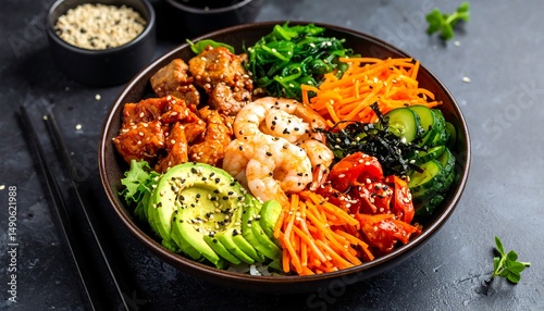 Delicious and Colorful Poke Bowl with Shrimp, Avocado, and Vegetables