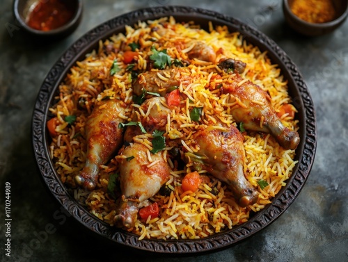 Delicious and flavorful chicken biryani served in a traditional round metal plate, garnished with cilantro and red onions.