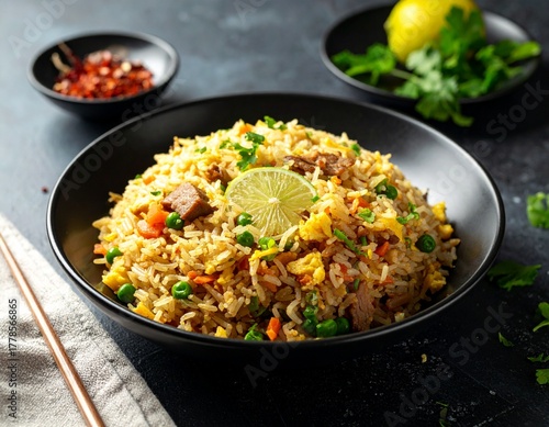 Delicious and flavorful fried rice in a black bowl, garnished with a slice of lime and herbs