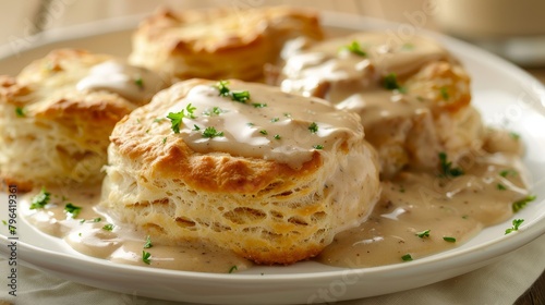 Delicious and healthy biscuits with gravy, using whole wheat biscuits, chicken sausage, and low-fat milk, prepared with less butter, isolated, studio lighting
