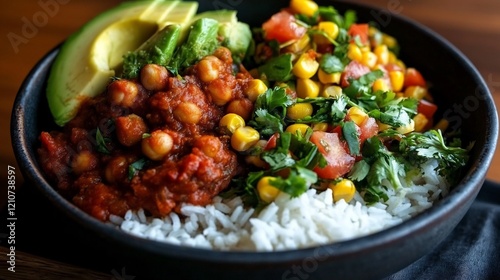 Delicious and Healthy Chickpea Bowl with Avocado, Corn Salsa, and Rice