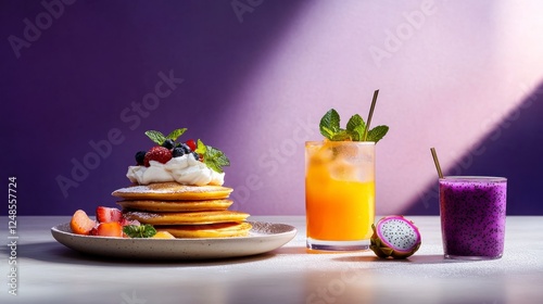 Delicious and healthy gourmet breakfast. Thin pancakes with fruits, berries and flowers.