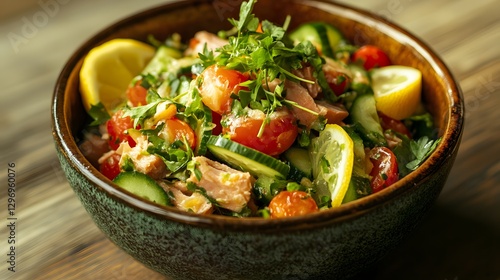 Delicious and Nutritious Tuna Salad with Fresh Ingredients and a Zesty Dressing in a Rustic Bowl