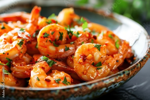 Delicious and spicy shrimps with herbs and chili pepper lying in a bowl, ready to be eaten