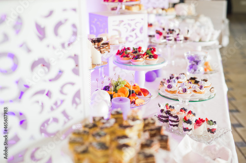 Delicious and tasty dessert table with cupcakes shots at reception closeup