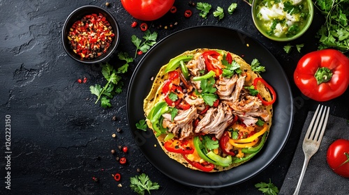Delicious and Vibrant Tostada with Pulled Pork and Colorful Vegetables on Dark Background