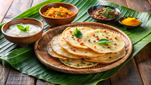 Delicious appalam served on wooden plate with vibrant side dishes, including spicy chutney, lentil curry, and yogurt, all beautifully arranged on banana leaf