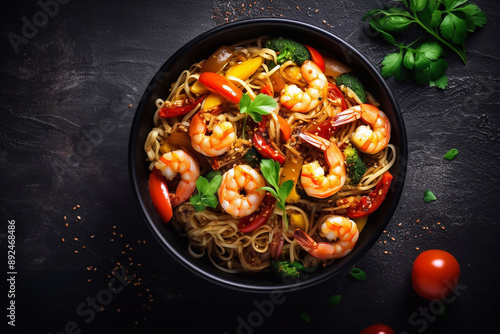 delicious appetizing pasta with seafood, tomato sauce and basil. top view