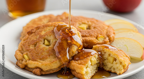 Delicious Apple Fritters With Maple Syrup Being Poured Onto A White Plate