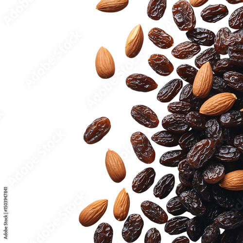 Delicious arrangement of fresh almonds and sweet raisins on a black background