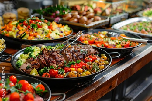 Delicious array of catering buffet food presented in an indoor restaurant setting Featuring grilled meats and a variety of gourmet dishes Perfect for social events and celebrations