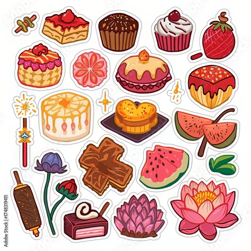 Delicious Asian Sweets and Festive Food Sticker Pack with Cakes and Lotus Flowers
