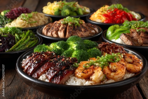 Delicious Asian-inspired meal featuring various dishes with shrimp, vegetables, and rice served on wooden table