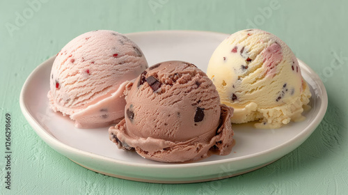 Delicious assorted ice cream scoops on white plate, perfect for dessert