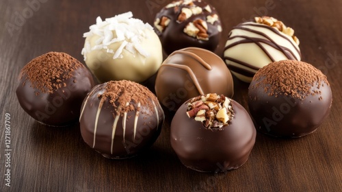 Delicious assortment of chocolate truffles on wooden table at a dessert shop. Generative AI