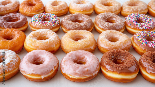 Delicious assortment of colorful donuts arranged neatly, perfect for any celebration