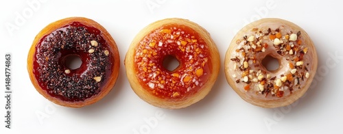 Delicious assortment of doughnuts with assorted fillings presented on a bright white background showcasing vibrant colors and textures